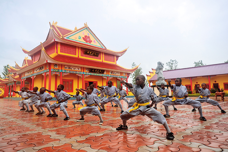 在位于赞比亚首都卢萨卡市郊区的少林寺文化中心,学员表演中国功夫(2023年1月21日摄)彭立军摄/本刊