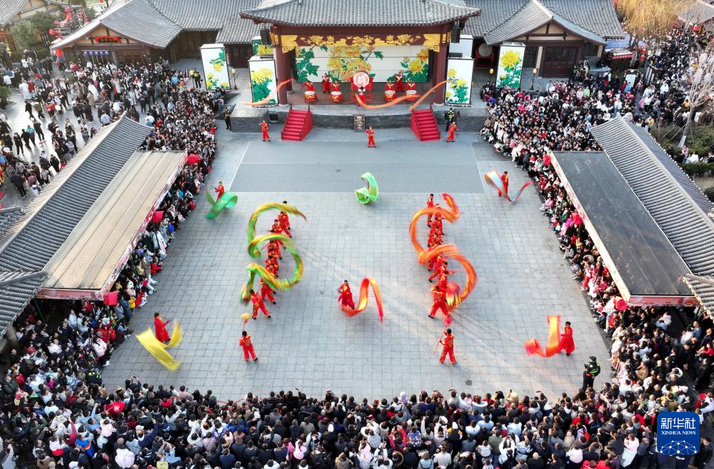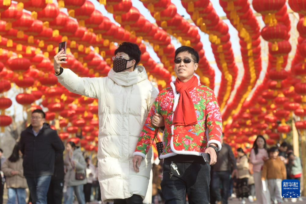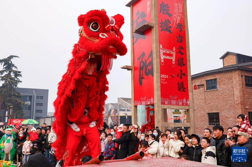 2月10日,游客在安阳市殷墟考古文旅小镇观看舞狮表演。新华社发 (麻翛然 摄)