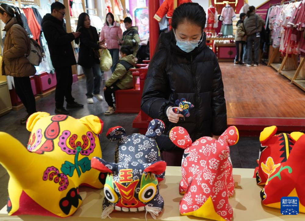 2月16日,游客在位于郑州市中牟县的电影小镇挑选布老虎。新华社记者 李安 摄