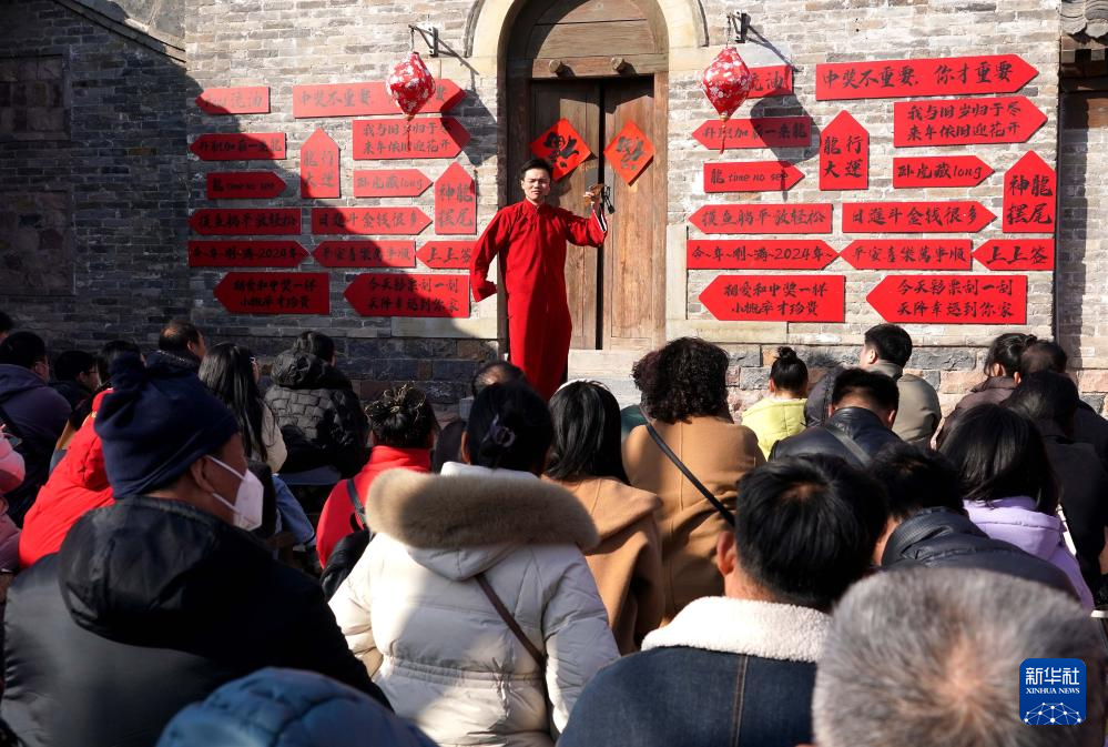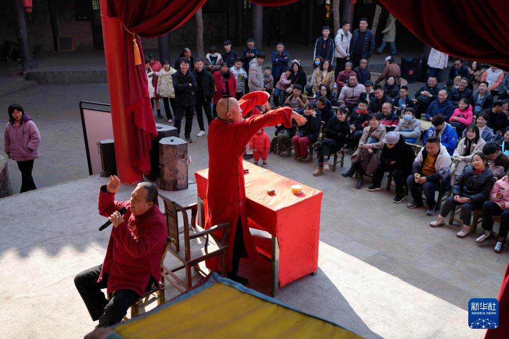 2月16日,游客在位于郑州市中牟县的电影小镇观看说书表演。新华社记者 李安 摄