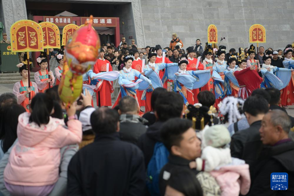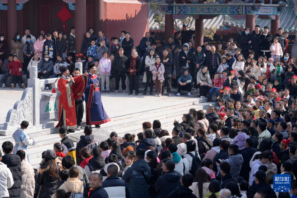 2月12日,游客在开封市开封府景区观看表演。新华社发(谭豫增 摄)