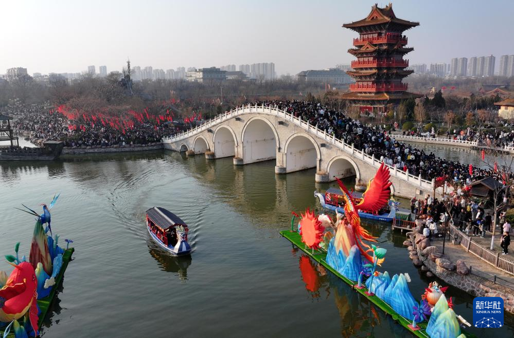 2月13日,游客在开封市万岁山景区观看表演。新华社发(谭豫增 摄)