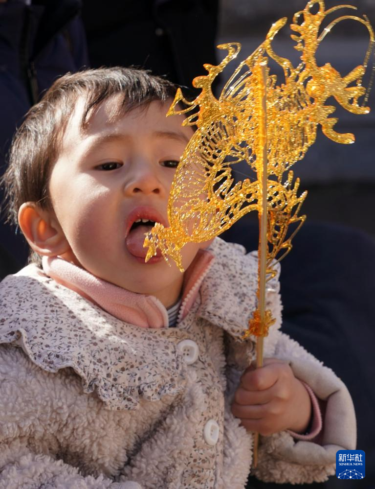 2月16日,小朋友在位于郑州市中牟县的电影小镇品尝糖画。新华社记者 李安 摄