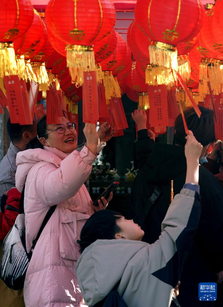 2月16日,游客在位于郑州市中牟县的电影小镇猜灯谜。新华社记者 李安 摄
