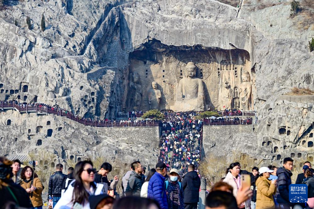 2月13日,游客在洛阳龙门石窟景区游览。新华社发(李卫超 摄)