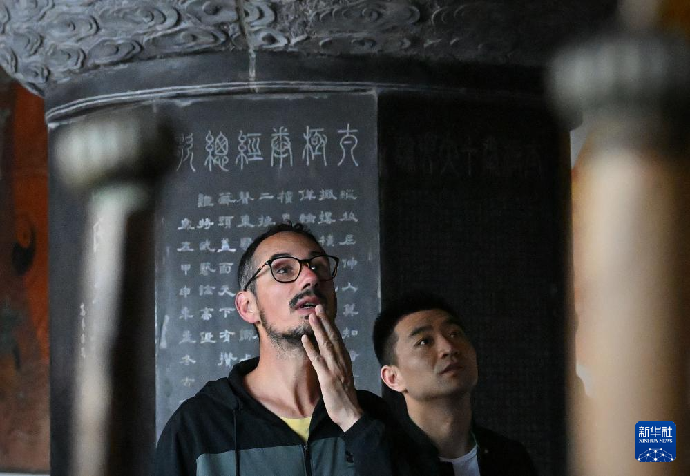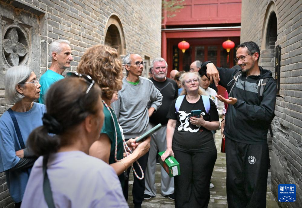 陈少拳(左一)带领法国学员在陈家沟太极拳祖祠内参观(2024年4月19日摄)。新华社记者 李安 摄