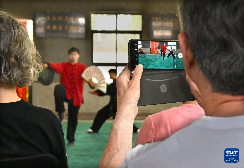 法国学员在陈家沟太极拳学校拍摄学生进行的太极扇表演(2024年4月18日摄)。新华社记者 李安 摄