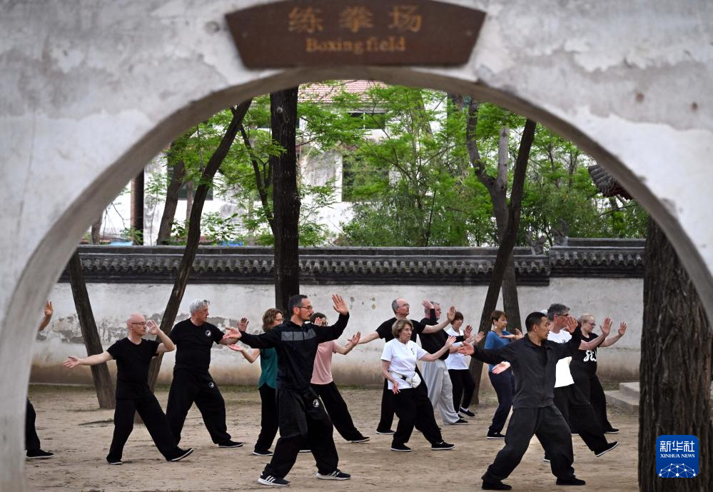 陈少拳(前左)和师父陈自强(前右)以及来自法国的学员们在陈家沟杨露禅学拳处练习太极拳(2024年4月18日摄)。新华社记者 李安 摄