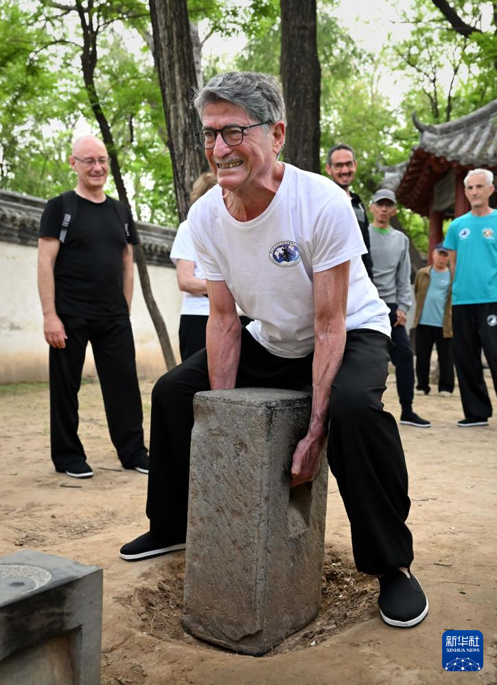 一名法国学员在陈家沟杨露禅学拳处体验练功垛石(2024年4月18日摄)。新华社记者 李安 摄