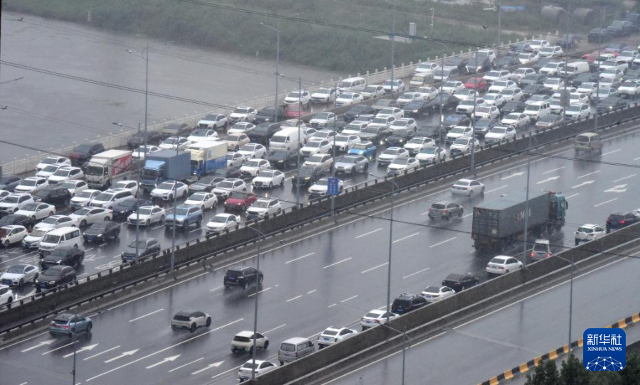7月8日,因前方道路积水,郑州东四环高架桥车辆严重受阻。新华社记者 朱祥 摄