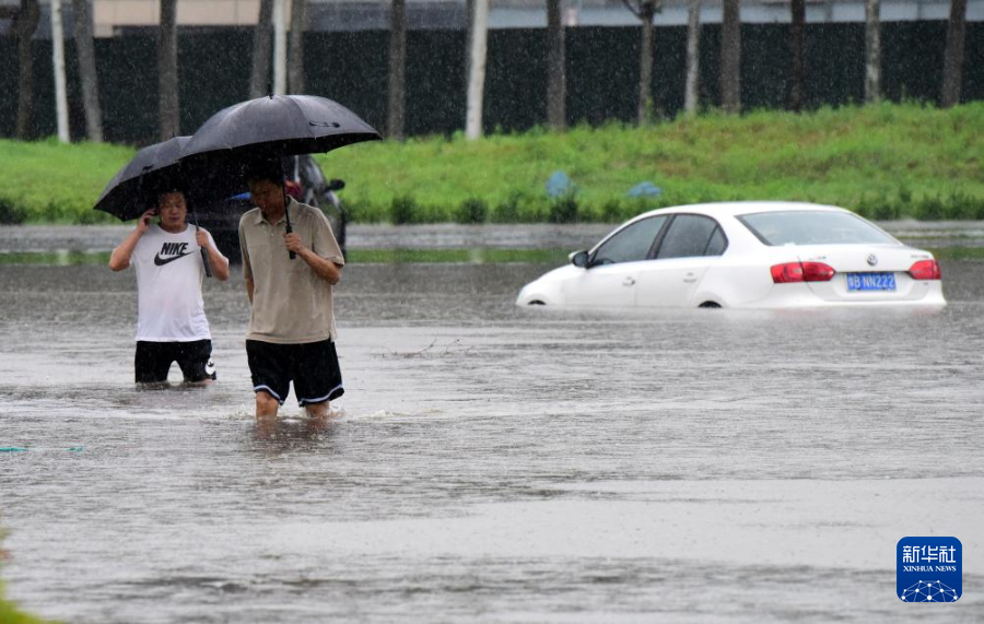 7月8日,在郑州东四环,行人涉水前行。新华社记者 朱祥 摄