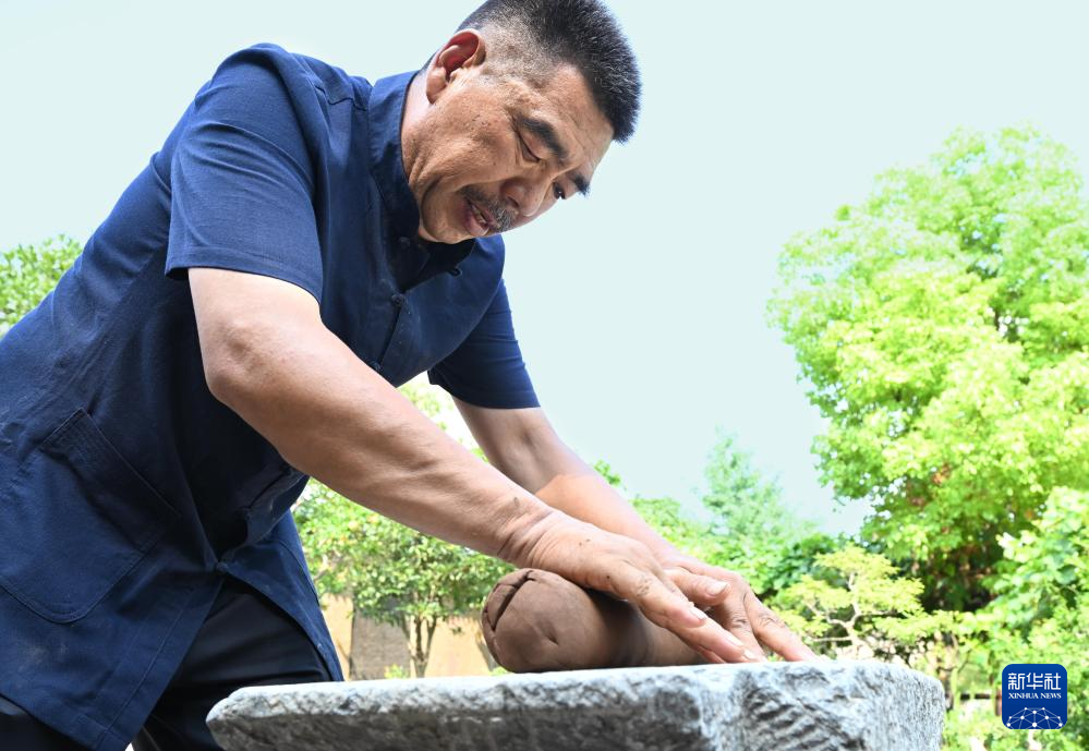 张书芳在香案上揉香泥(7月3日摄)。新华社记者 李安 摄