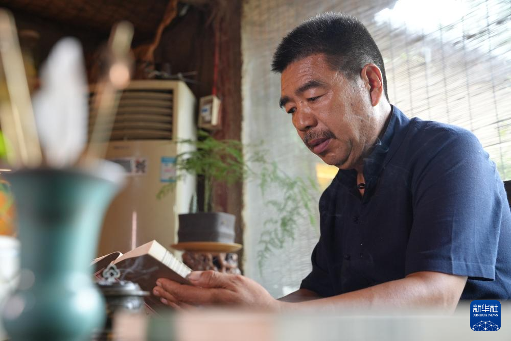张书芳在阅读香谱,查阅制香古方(7月9日摄)。新华社发(苏筱雅 摄)