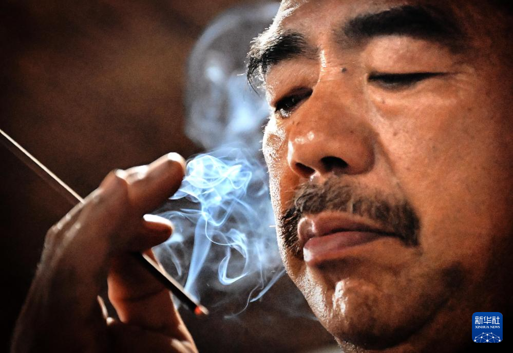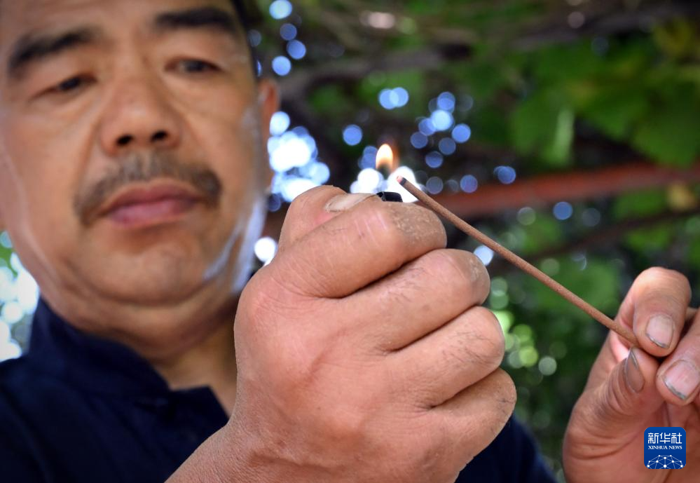 张书芳将制成的线香点燃,进行“品香”,从而检验香品是否合格(7月3日摄)。新华社记者 李安 摄
