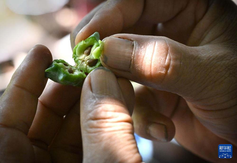 张书芳(左)在给儿子张力传授品评香珠品质的标准(7月3日摄)。新华社记者 李安 摄
