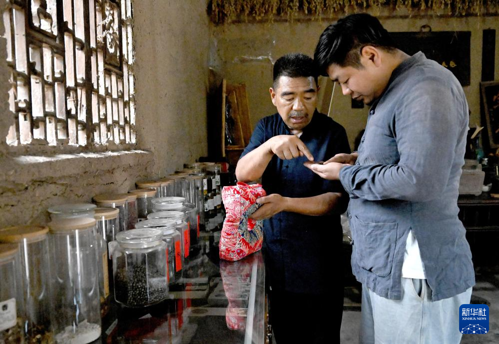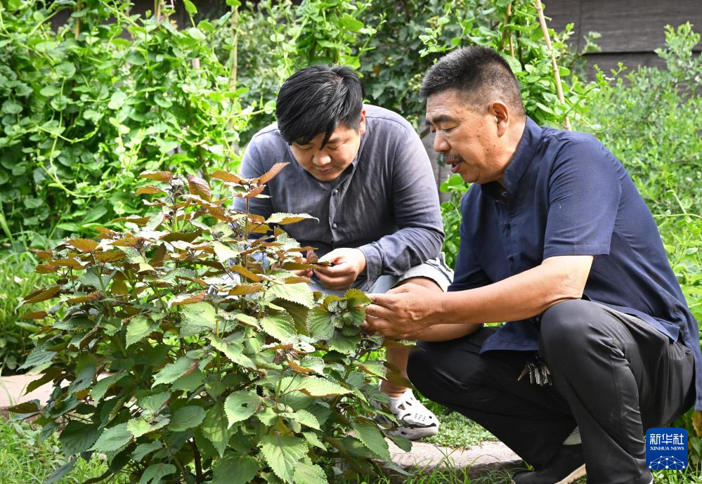 张书芳(右)在中草药种植园教儿子张力分辨中药材,讲解药材的药性(7月3日摄)。新华社发(苏筱雅 摄)