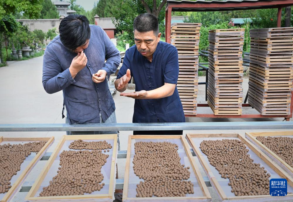 张书芳在查看制香原材料柏子仁的品质(7月3日摄)。新华社记者 李安 摄