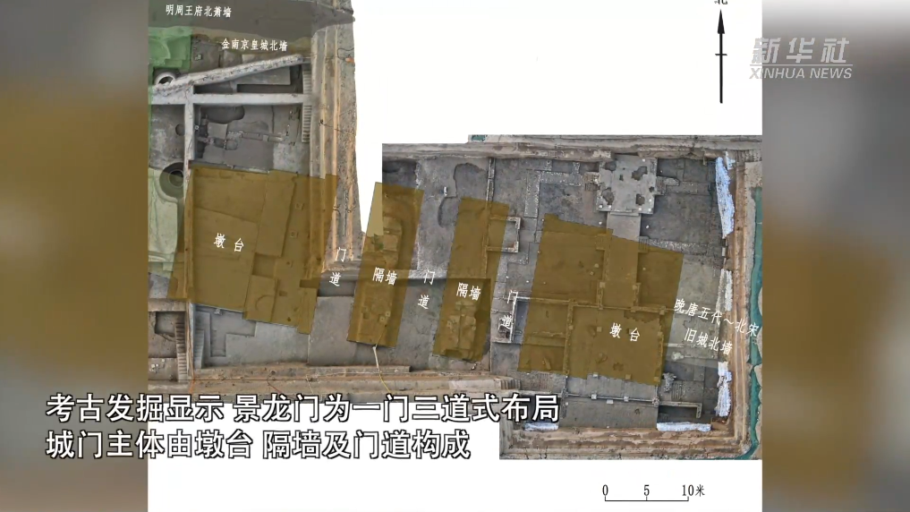 考古发掘显示,景龙门为一门三道式布局,城门主体由墩台、隔墙及门道构成。城门通阔约60米,门道进深约19.3米,城门及墩台包砖,逐层错缝露龈内收,三门道宽度相同,均约5.6米。整体规模大于此前发现的北宋东京城顺天门遗址。