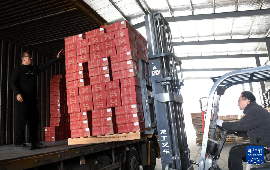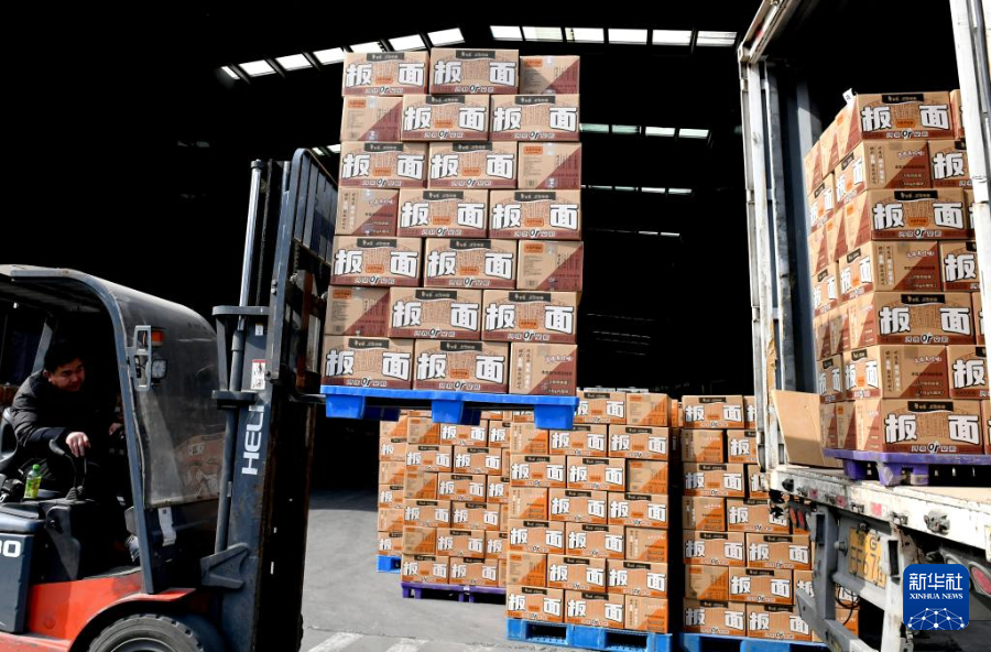 2月27日,工人在河南省温县一家方便速食企业厂区将产品装车外运。新华社记者 朱祥 摄