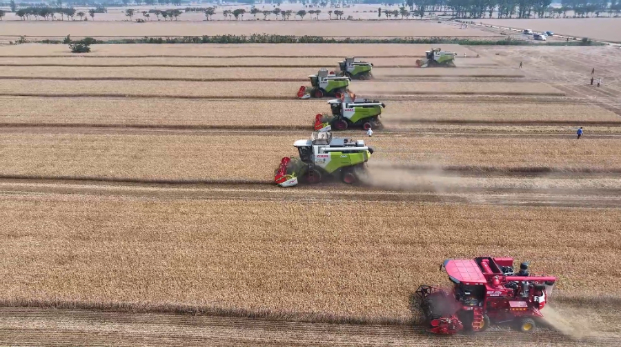 20日,在河南省南阳邓州市腰店镇,一望无垠的金色麦田麦浪阵阵,机声隆隆。小麦联合收割机一字排开,在麦田中“过招”,比拼机收减损水平,这场机收减损技能大比武活动标志着当地小麦迎来大面积机收。