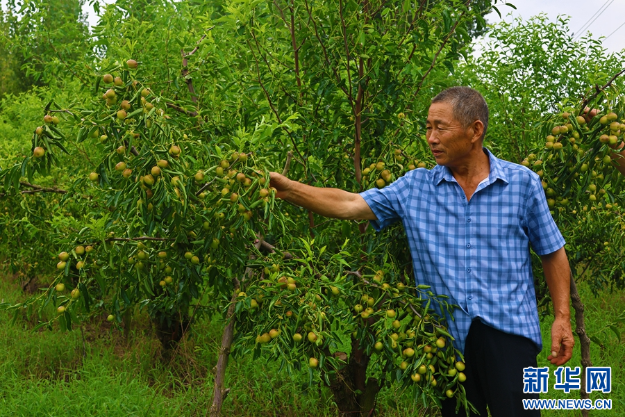 8月12日,枣农在南阳市社旗县下洼镇郭庄冬枣采摘园管护冬枣。