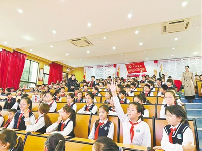 开幕式后,中国科学院自动化所研究员杨鑫为天宝路学校初中部的学生带来了科普讲座《身份识别的奥秘——生物特征识别技术》,现场气氛热烈,学生纷纷举手和老师互动(如图)。同期,另有3位专家赴其他3所学校开展科普活动。