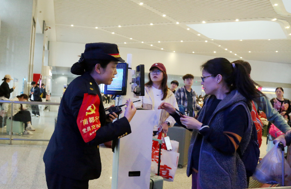 “今年八天假期,我们站组织党员骨干20人,每天穿梭在售票厅、候车室、站台上,忙碌于进站口、安检处、电梯旁,主动解答旅客问询、引导换乘路线、卡控安全关键……”南阳东站党支部书记刘超说,“大家干劲十足,希望为旅客提供美好的出行体验!”