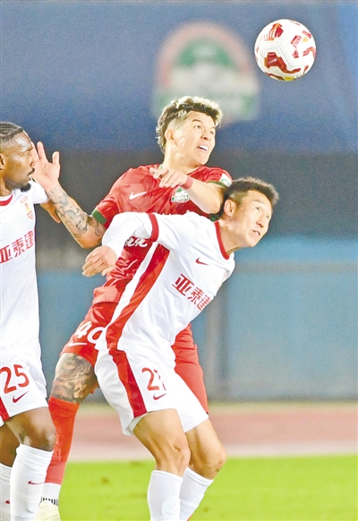 河南队球员纳萨里奥(上)在比赛中争抢头球