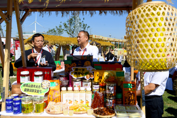 2024年9月22日,人们在中国农民丰收节全国主场活动现场一处农产品展位前品尝展品。新华社记者 郝源 摄