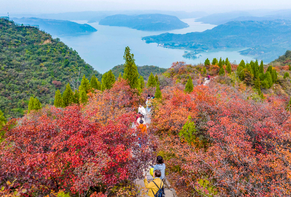 2025年10月25日,游客在河南省洛阳市新安县荆紫仙山景区观赏红叶(无人机照片)。新华社发(张怡熙 摄)