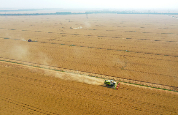 2025年5月29日,在河南省周口市西华县黄泛区实业集团农业第四分公司的麦田里,农机手操作收割机收获小麦(无人机照片)。新华社记者 郝源 摄
